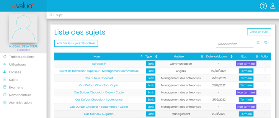 Une fois connecté sur Evaluo, cliquez sur l’onglet "Sujets" dans le menu principal.